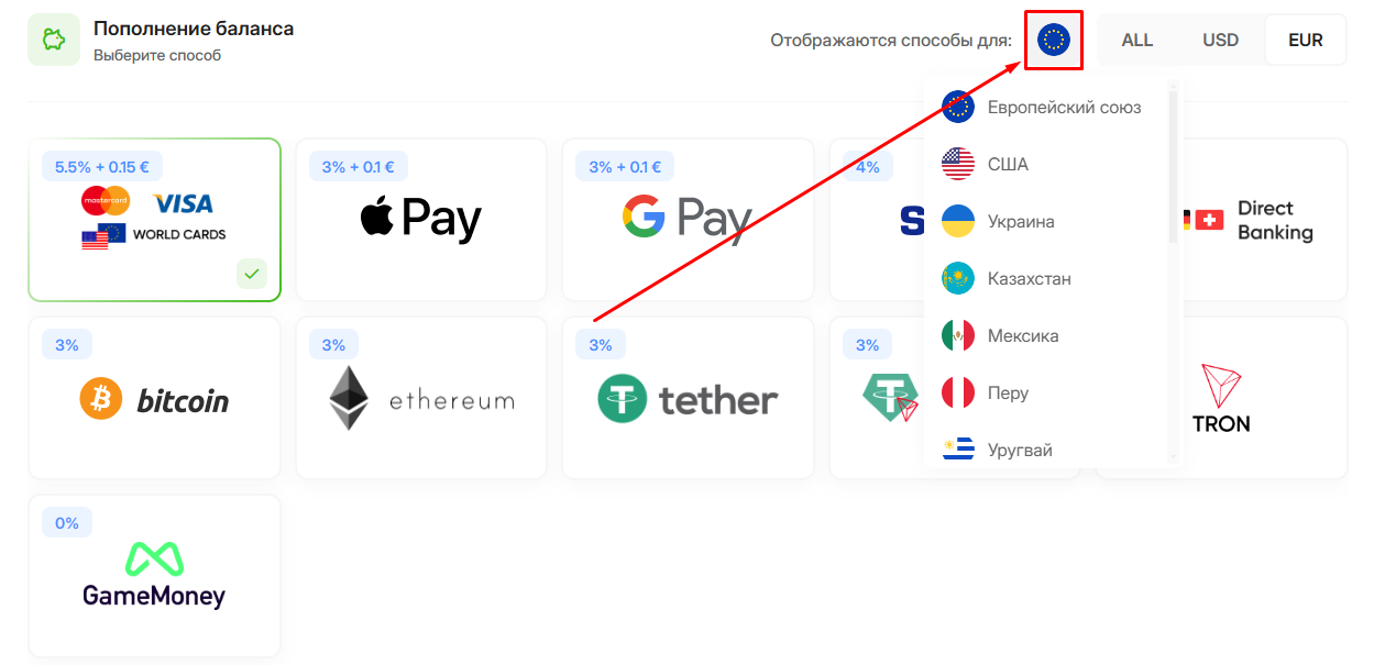 Кошельками/картами каких стран я могу пополнить счет?