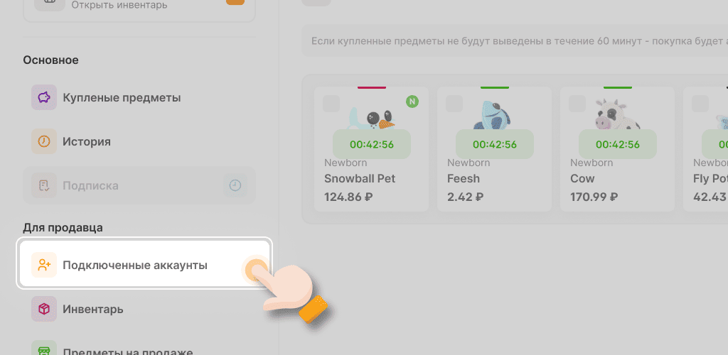 Все купленные предметы после оплаты попадают на вкладку профиля "Купленные предметы", после чего у вас есть ровно 1 час, чтобы их вывести. Для того чтобы передать купленные предметы на свой аккаунт в игре, вам нужно выбрать те предметы, которые хотите вывести, и нажать на кнопку "Забрать". После этого введите свой никнейм в игре и выберите свой аккаунт, далее действуйте по инструкции на экране.