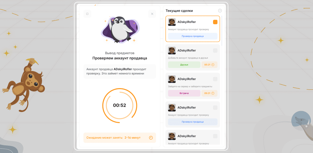 Все купленные предметы после оплаты попадают на вкладку профиля "Купленные предметы", после чего у вас есть ровно 1 час, чтобы их вывести. Для того чтобы передать купленные предметы на свой аккаунт в игре, вам нужно выбрать те предметы, которые хотите вывести, и нажать на кнопку "Забрать". После этого введите свой никнейм в игре и выберите свой аккаунт, далее действуйте по инструкции на экране.